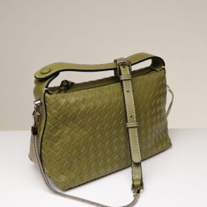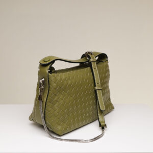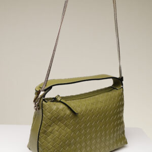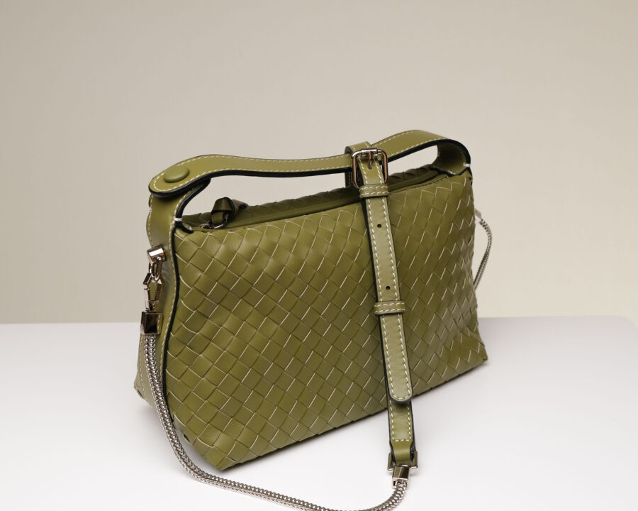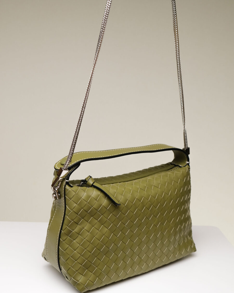 Primrose, genuine leather woven bag with silver hardware. Can be hand held or used with adjustable crossbody silver chain strap.