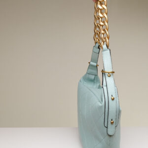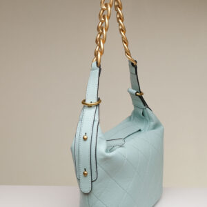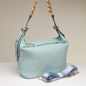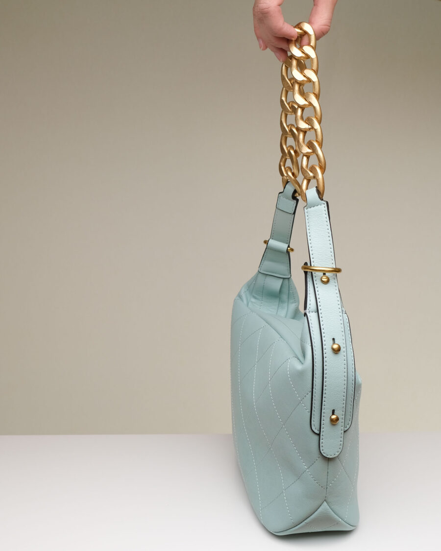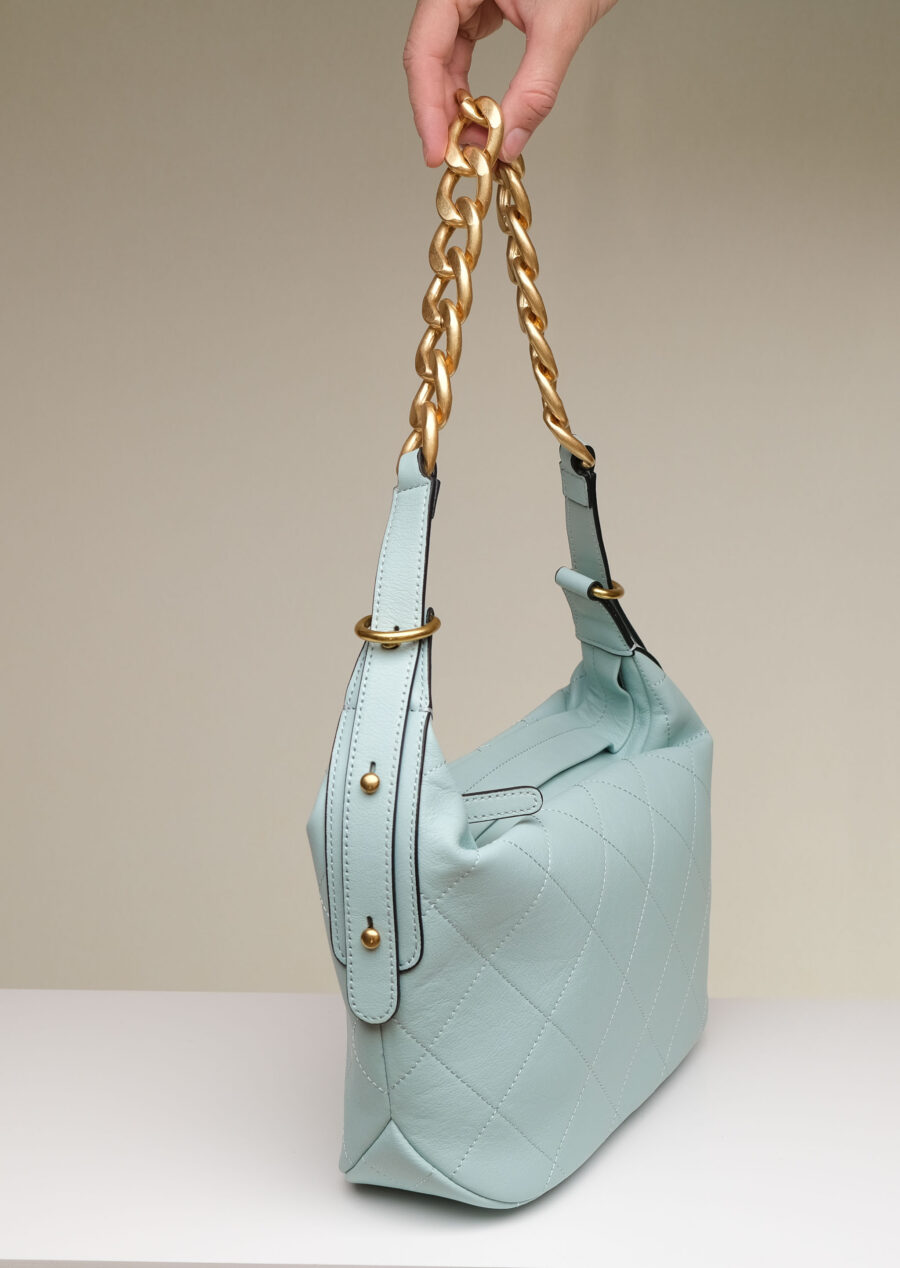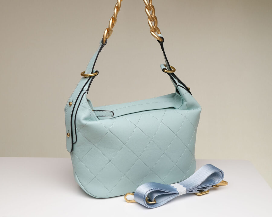 Violet, genuine leather multiple wear bag with golden chain and fabric adjustable handles.